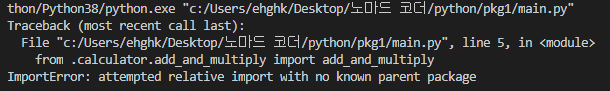 Traceback (most recent call last): File "C:\project\main.py", line 4, in <module> print(mul(1, 2)) # 에러: add 함수는 공개되어 있지 않으므로 사용할 수 없음 NameError: name 'add' is not defined